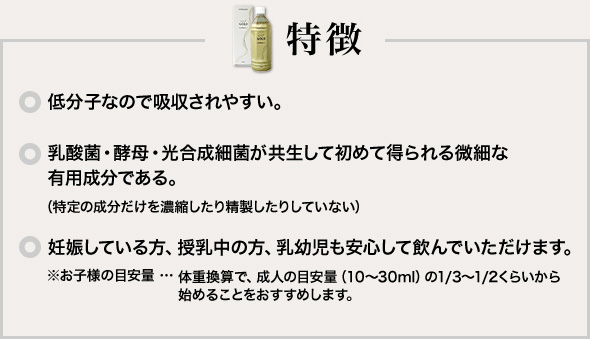 光合成細菌を中心とした有用微生物群から独自の技術で抽出したエキスが健康維持をサポートします。