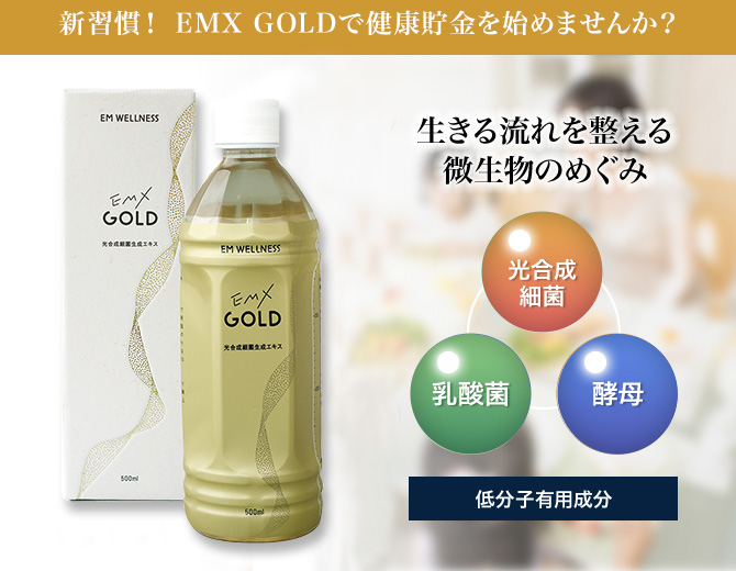 そんな時におススメしたいのが、「光合成細菌生成エキス」のEMX GOLD。コツコツ続けられて、病気になりにくい体をつくる「健康貯金」の頼れるサポーターです。